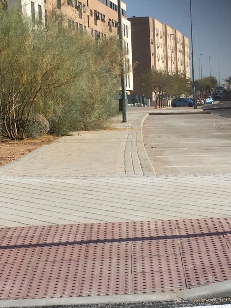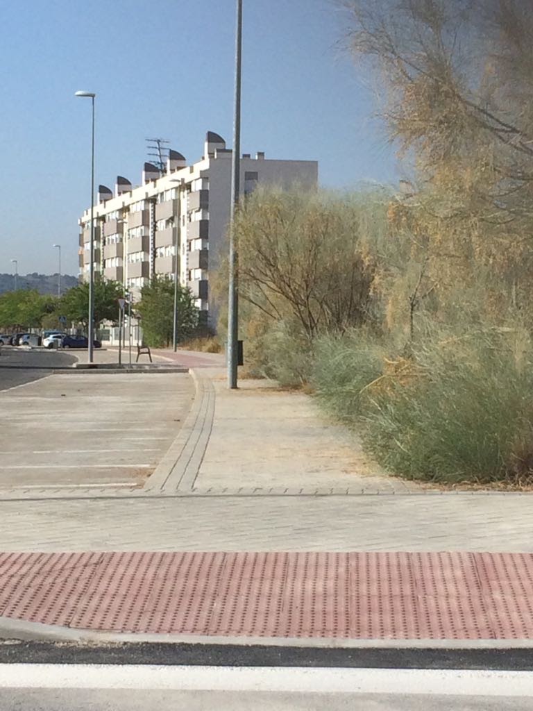 Fotos denuncia de un compañera de ADEMTO que no se puede pasar por la acera con la sillas de ruedas, por estar invadida por la  maleza. Asimismo la rotonda de la calle Guadarrama con Río Bullaque y Río Mesa se debería poner solución a los bordillos del paso de peatones por su excesiva altura.