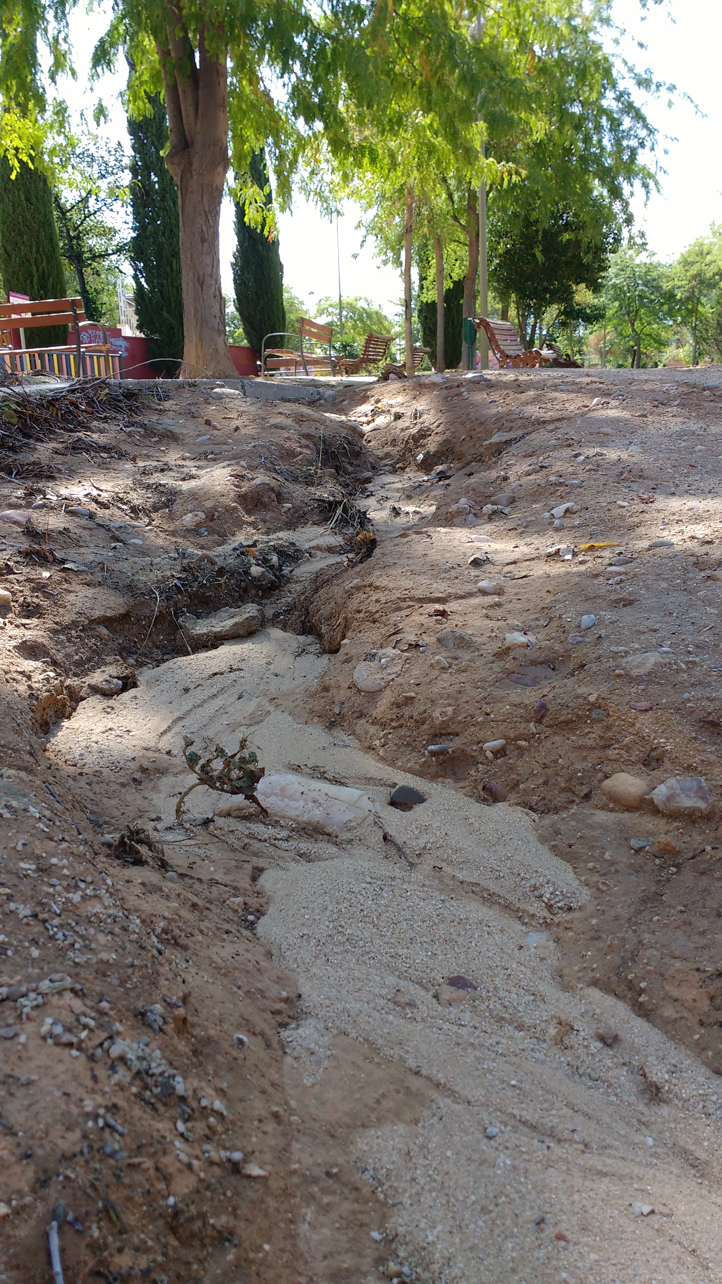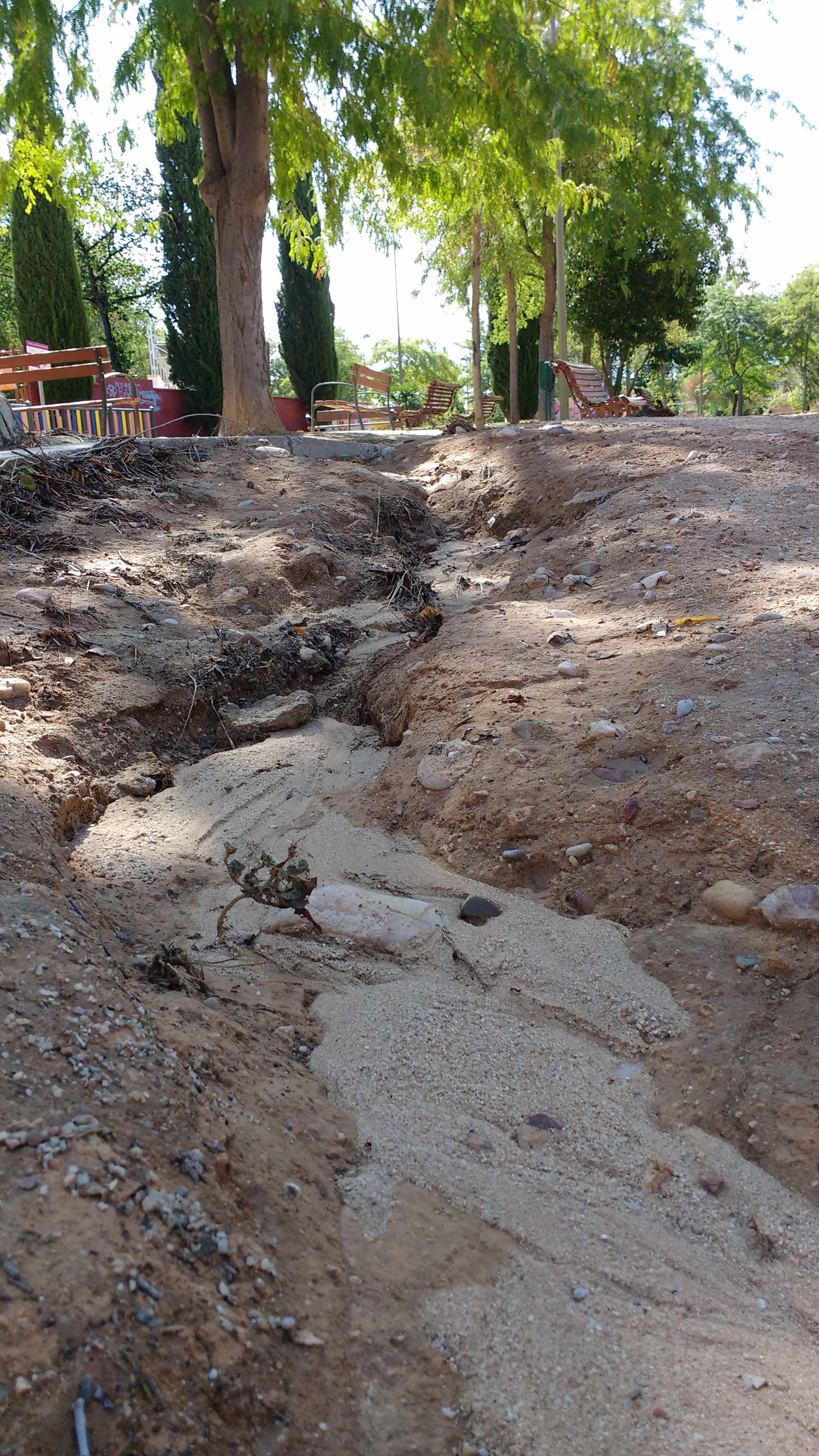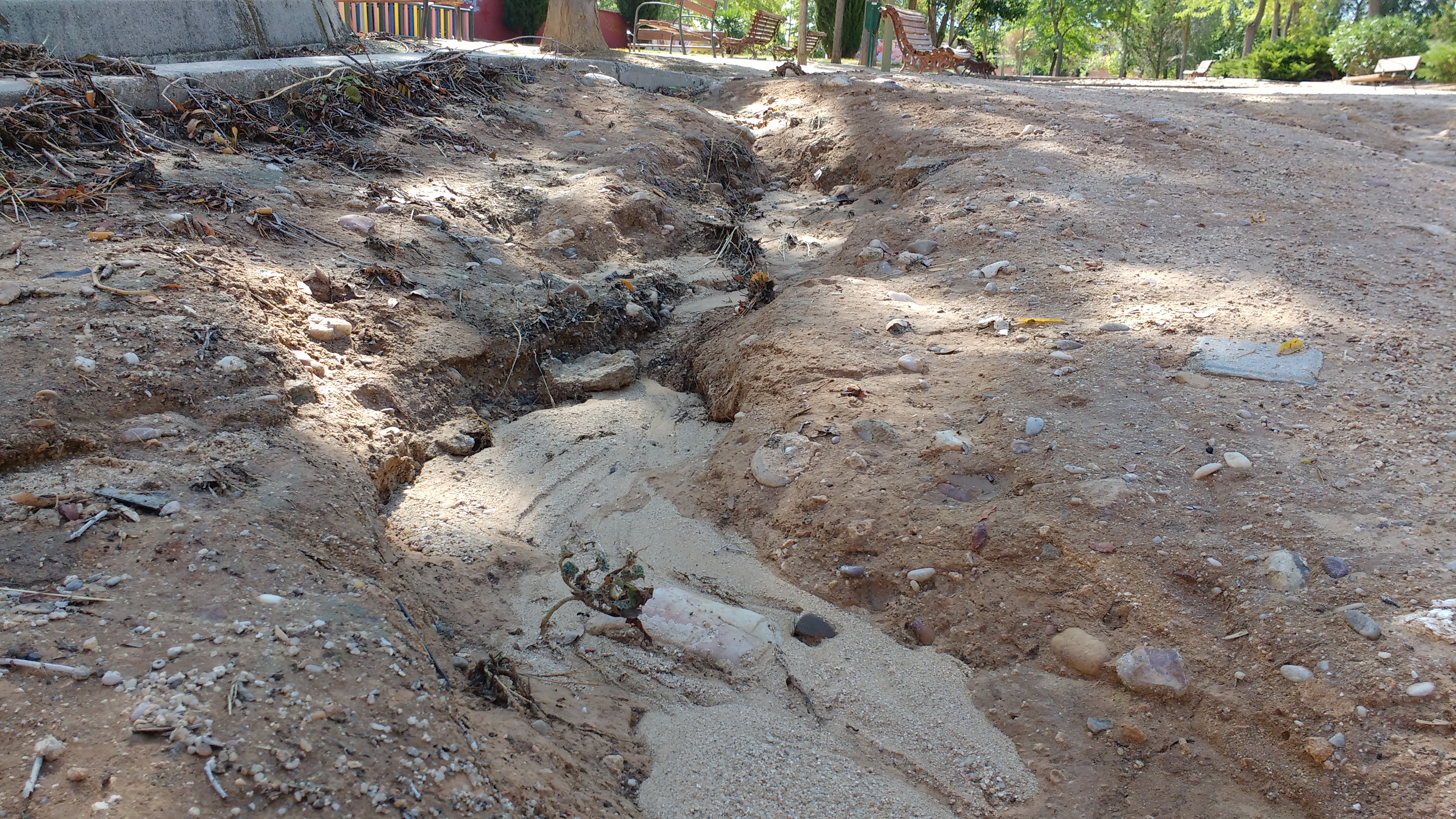 Como en cada ocasión que llueve el agua arrastra la tierra y el paseo queda en similares condiciones, no es solo esta vez. Venimos demandando que se tomen medidas, pero lo único que se hace es volver a reponer la tierra en la cárcava o surco que se hace y perder horas y hasta días para esta operación que se distraen del mantenimiento del parque, que también necesita un repasito.