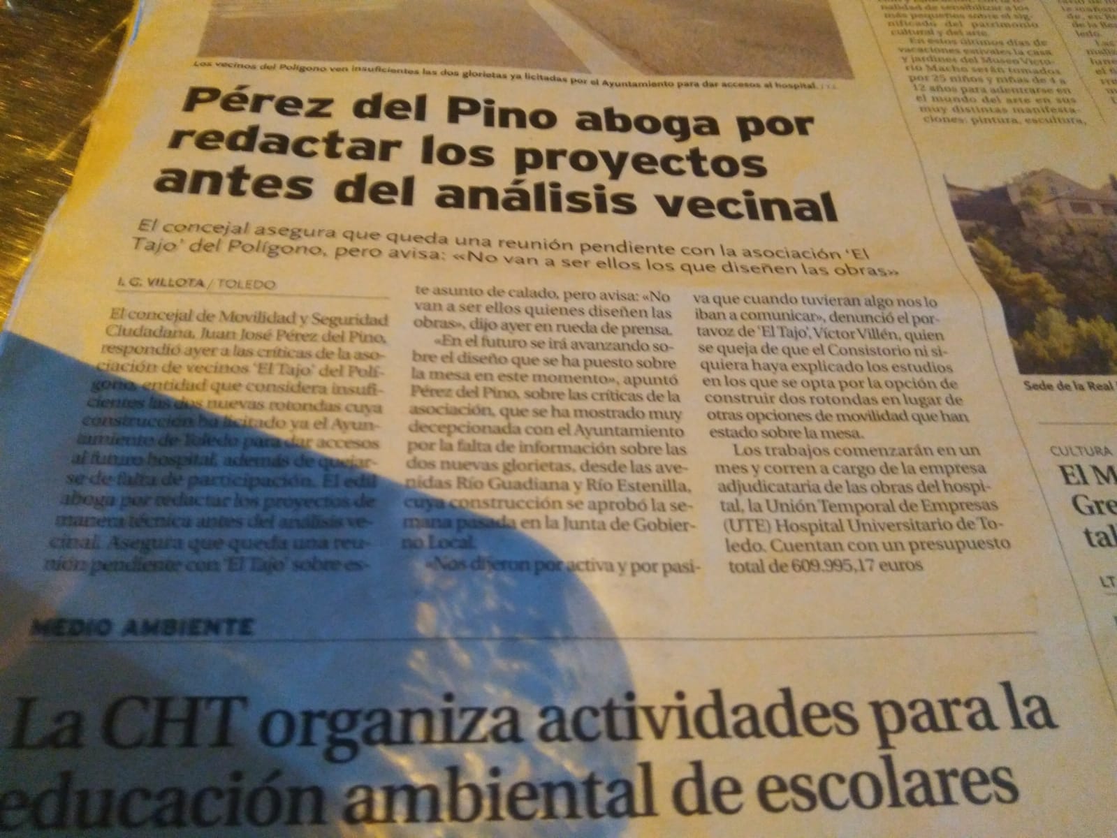 A Perez del Pino le pueden haber no gustado las declaraciones de la asociación de vecinos El Tajo sobre la noticia de las dos rotondas en el entorno del hospital, porque demandamos participación y un proyecto integral, sobre todo chirría bastante diciendo que «no vamos a ser nosotros los que diseñemos las obras», ¿cuando hemos dicho esto en alguna ocasión?.