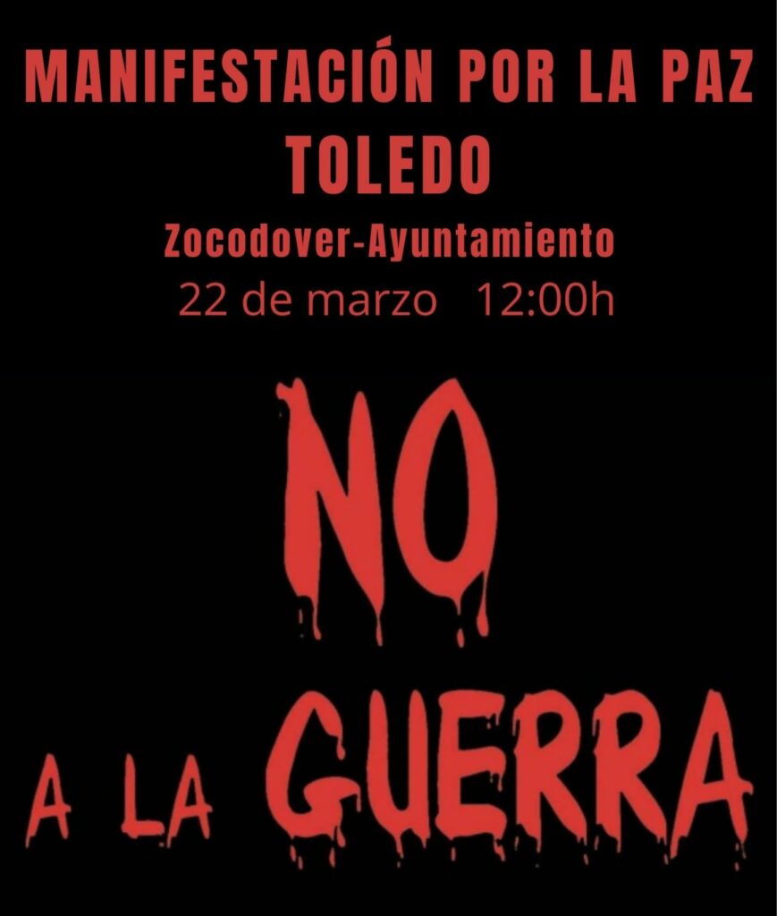 Convocatoria de la Plataforma No a la Guerra próximo domingo 22 de marzo a las 12:00 en la plaza de Zocodover hasta el Ayuntamiento de Toledo